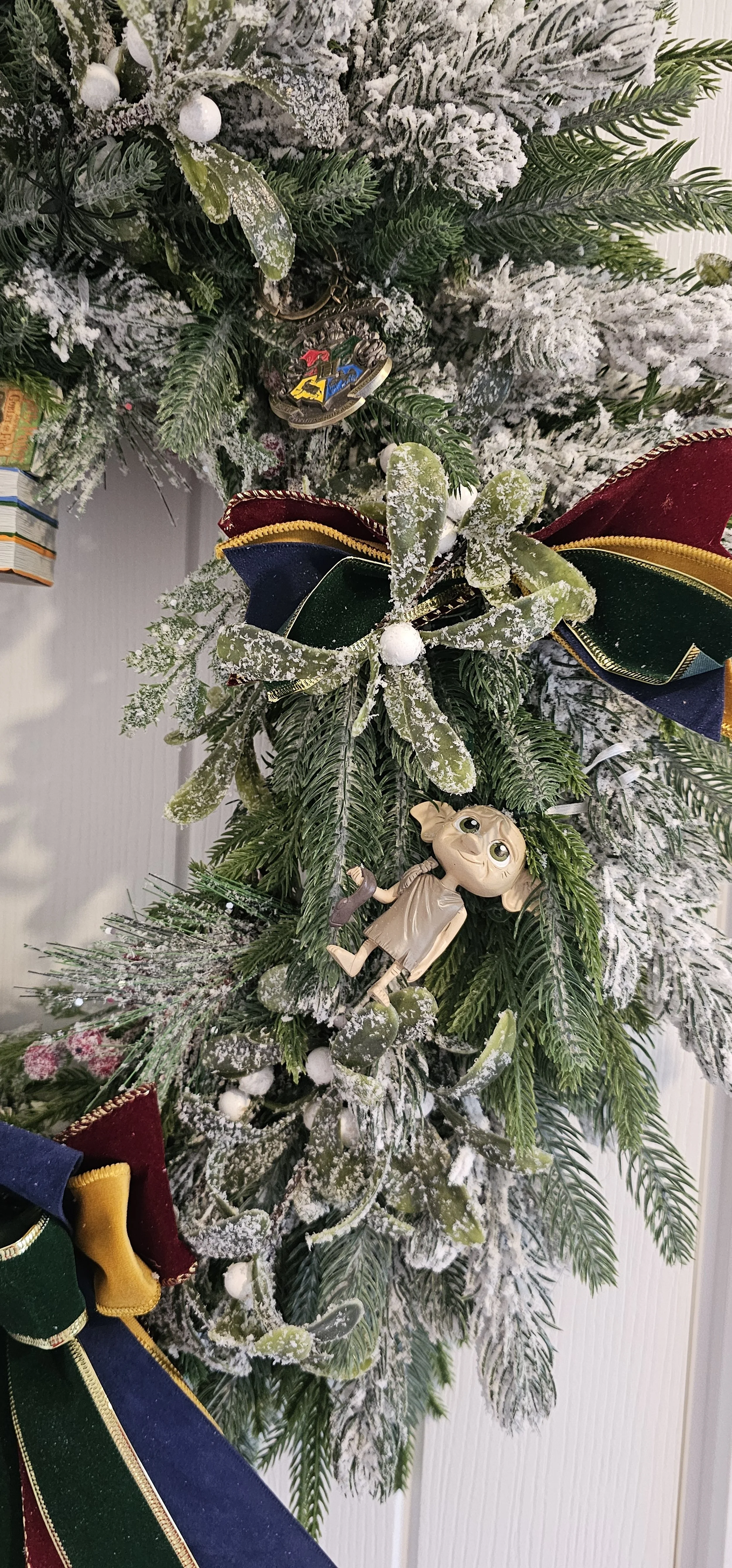 The wreath features a curated selection of official Hallmark Harry Potter ornaments, including the Books & Wand, Hogwarts Acceptance Letter, Dobby the Elf (and his sock), the Trolley Cart with suitcase and Hedwig. A bronze Hogwarts Crest and frosted greenery with delicate spiders add a whimsical touch. Velvet ribbons in the four house colours: Burgundy, Navy, Green, and Gold, are woven throughout edged in gold for a refined, luxurious finish.