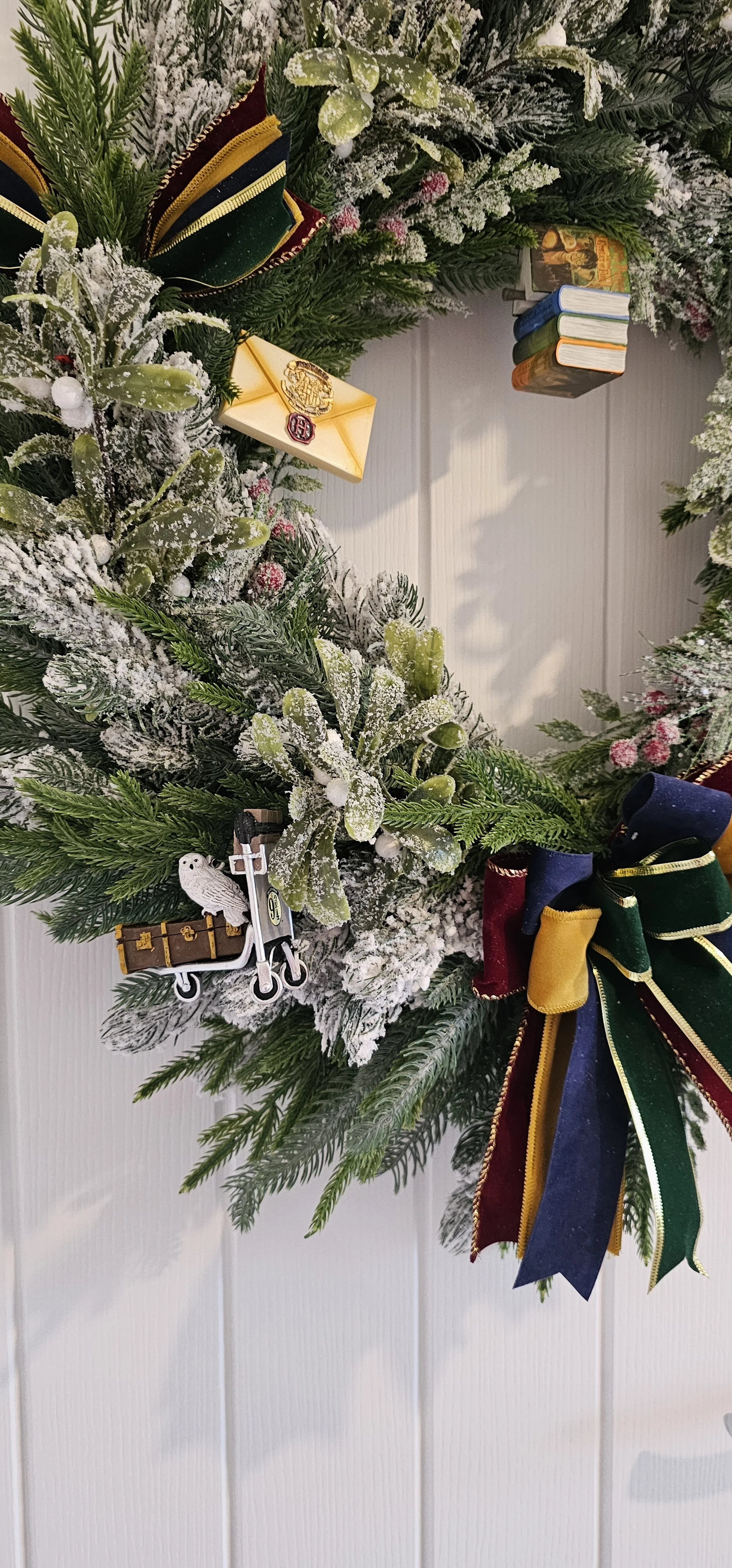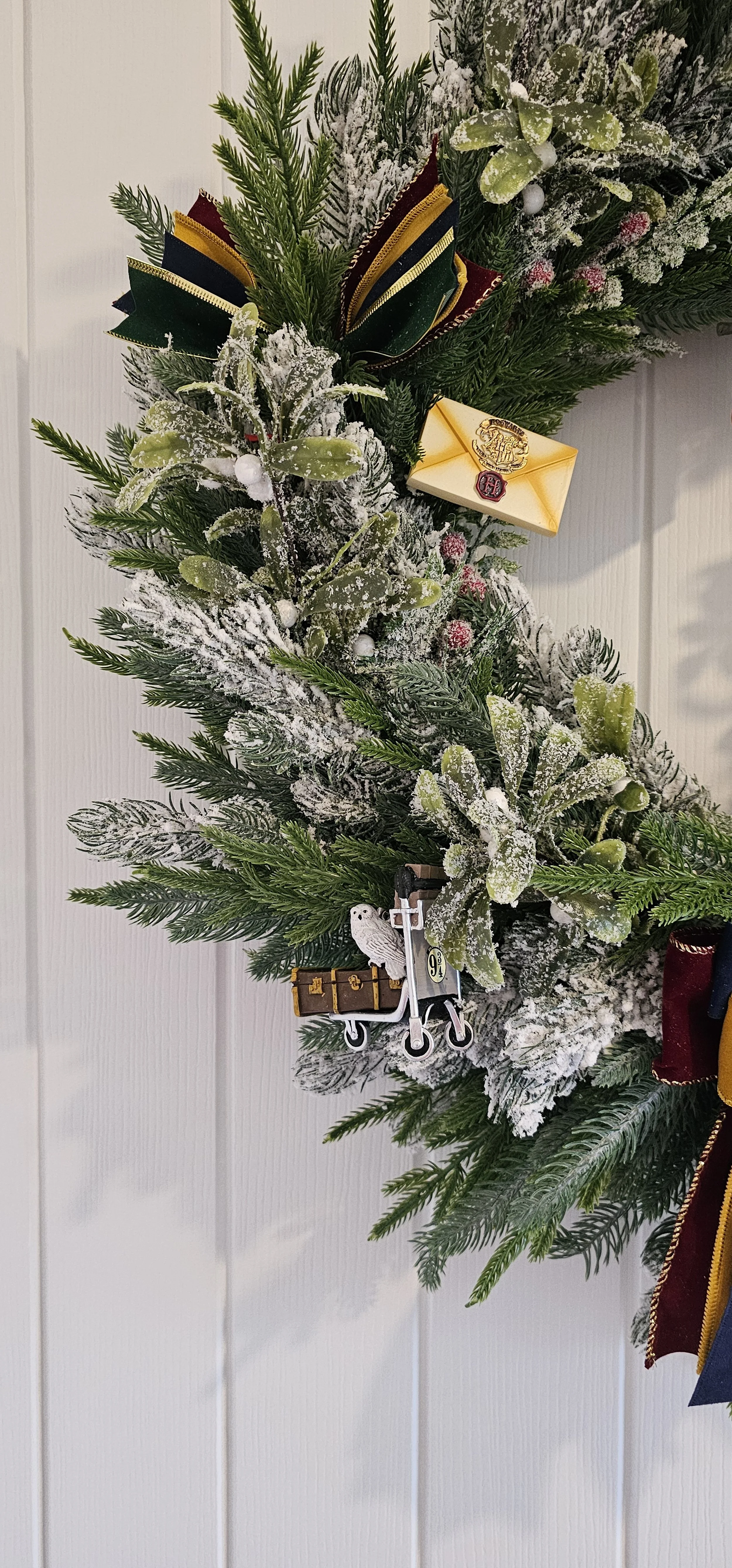 Enchanted Winter at Hogwarts brings colour, texture, and story together in perfect harmony a wreath that is both magical and sophisticated, worthy of any grand hall or festive doorway.